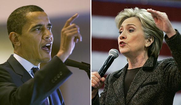 13일 버락 오바마 미 민주당 대선주자가 라스베가스의 한 교회에서(왼쪽 사진) 힐러리 미 민주당 대선주자가 콜럼비아의 한 시청에서 유세 중 연설하고 있다. AP 연합