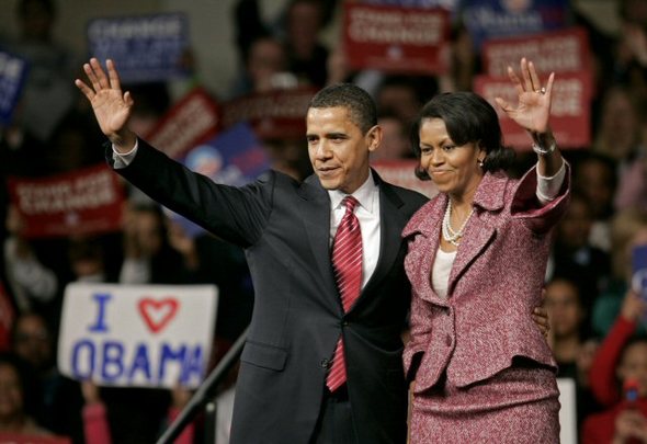 오바마 상원의원이 26일(현지시간) 미 대선 사우스 캐롤라이나주 민주당 경선에서 부인과 함께 손을 흔들고 있다 (AP=연합뉴스)