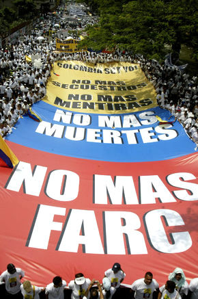 콜롬비아 수도 보고타에서 4일 시민들이 팔목을 쇠사슬로 묶은 채 콜롬비아무장혁명군에 항의하는 집회를 열고 있다. 이날 콜롬비아 주요 도시들에서 흰색 티셔츠를 입은 수십만명이 반군에게 납치 중단과 인질 석방을 요구하는 행진을 벌였다.