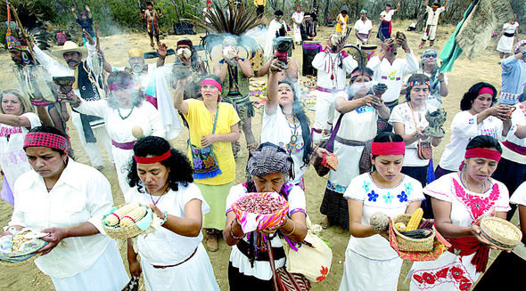멕시코 수도 멕시코시티에서 9일 전통 무용수들이 옥수수 바구니를 들고 멕시코산 농산물을 지켜 달라고 기원하는 의식을 치르고 있다. 멕시코 농민들은 북미자유무역협정(NAFTA) 일정표에 따라, 보조금을 받는 미국·캐나다산 농산물이 쏟아져 들어오면 멕시코산은 설 땅을 잃는다며 반발하고 있다.