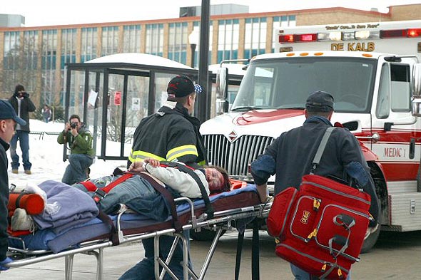 14일 시카고 교외 노던 일리노이 대학에서 총기난사 사건이 발생해 구조대원들이 한 부상자를 실어나르고 있다. AP 연합