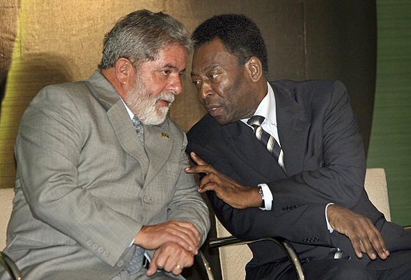 루이스 이나시오 룰라 다 실바 브라질 대통령이 18일 브라질의 복권게임 타임매니아의 런칭 행사에서 축구스타 펠레와 이야기나누고 있다. AP 연합