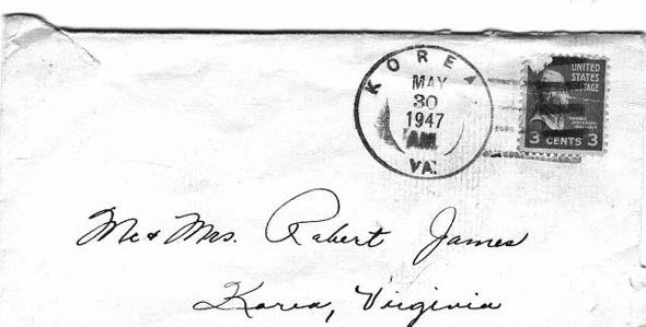 1947년 5월30일자 `코리아 우체국‘ 소인이 찍힌 편지 봉투. 주소란에 `버지니아 코리아‘라고 마을 이름이 적혀 있다. 워싱턴/연합뉴스