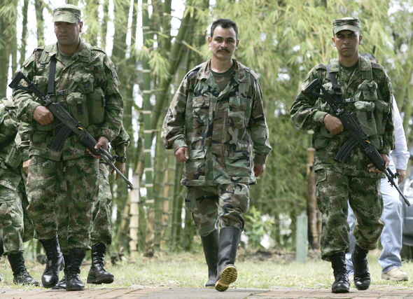 전 콜롬비아무장혁명군 소속 군인 페드로 몬토야(가운데)가 8일 콜롬비아 페레이라의 정부군 기지에서 정부군 호위병들과 함께 기자회견장으로 걸어가고 있다. 몬토야는 반군 고위 간부이자 직속 상관인 이반 리오스를 죽인 뒤 그의 주검 일부와 노트북 컴퓨터 등을 들고 정부군에 투항했다. 페레이라(콜롬비아)/AP 연합