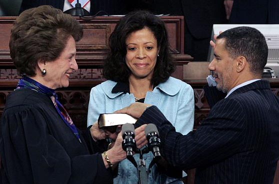 데이비드 패터슨 뉴욕주 부지사(오른쪽)가 17일 올버니 소재 주 의사당에서 열린 취임식중 부인(가운데)이 지켜보는 가운데 주디스 S. 케이 뉴욕주 대법원장 앞에서 제 55대 주 지사 취임선서를 하고 있다. AP 연합