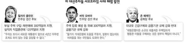 서브프라임 모기지(비우량 주택담보대출) 부실 사태로 집에서 쫓겨나는 서민의 구제와 주택시장 붕괴 대책이 미국 대선의 뜨거운 쟁점으로 떠올랐다. 파산 위기에 몰린 대형 투자은행과 마찬가지로 서민들에게도 직접적 지원을 해야 하는지를 놓고 공방이 치열하다.