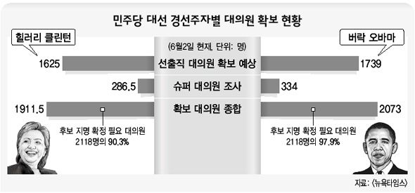 기나긴 미국 민주당 대선 경선 마라톤이 3일(한국시각 4일 오전) 드디어 막을 내린다. 이날 사우스다코타·몬태나 두 지역 예비선거를 끝으로 지난 1월3일 이후 5개월간의 뜨거웠던 경쟁을 마감한다. 하지만 경선 마라톤의 최종 승자는 버락 오바마 상원의원으로 사실상 결정났다. 2일 현재 오바마는 후보 지명에 필요한 대의원 2118명의 97.9%인 2073명을 확보했다. 31명의 대의원이 걸린 3일 두 곳의 예비선거에서 승리할 것으로 예상돼, 약 20명의 대의원을 추가로 확보하게 된다. 지지 후보를 밝히지 않았던 슈퍼대의원 약 200명의 지지선언이 잇따를 전망이다. 클레어 매캐스킬 상원의원(몬태나)은 “10명의 슈퍼대의원과 상의했는데, 모두 3일 해가 지기 전에 지지 후보를 밝힐 것이라고 말했다”고 전했다. 이 때문에 오바마는 “2~3일 내에 후보 지명에 필요한 대의원을 확보할 것 같다”고 내다봤다. 현지 언론들은, 설령 슈퍼대의원들의 지지선언이 다소 늦어지더라도, 5일까지는 오바마가 후보 지명 확정에 필요한 대의원을 확보할 것으로 내다봤다. <워싱턴포스트>는 “오바마는 3일 저녁 승리를 선언할 수 있을 것이라고 낙관하고 있다”고 전했다. <아에프페>(AFP) 통신은 “오바마가 굴곡 많았던 승부 끝에 미국의 첫 흑인 대통령 후보로 선출되기 직전이다”라고 평가했다. “언제 승리를 선언하느냐”는 시간문제만 남은 것이다. 일단 오바마는 3일 저녁 미네소타주 세인트폴 엑셀 에너지센터에서 승리를 선언할 게 유력하다. 공화당이 9월 전당대회에서 후보를 공식 지명할 상징적 장소에서 승리를 선언하고, 곧바로 존 매케인 공화당 후보와의 본선 대결에 나선다는 전략이다. 아직도 힐러리가 3일 예비선거 뒤 곧바로 패배를 인정할지에 대해서는 전망이 엇갈린다. 경선 포기 선언 및 오바마 지지 선언, 전당대회까지 유세 지속, 선거운동 일시 유보 등 다양한 전망이 나온다. 현지 언론들은 조심스레 3일 밤 힐러리가 패배를 인정할 것으로 점치고 있다. 힐러리가 이날 자신의 지역구인 뉴욕에서 저녁 유세를 한다는 점과 캠프 직원들이 비용 결산을 하도록 지시받았다는 소식 등이 그 배경이다. <뉴욕 타임스>는 이날 연설을 일부에서는 “작별 연설”로 표현하고 있다고 전했다. 남편 빌 클린턴 전 대통령도 2일 “오늘이 이런 종류의 캠페인에 참가하는 마지막 날이 되기를 바란다”고 말했다. 이 때문에 “힐러리에게는 빠르고 우아한 탈출구를 제공하고, 오바마에게는 첫 흑인 대통령 후보의 길을 닦는 데 민주당 지도부가 물밑 작업을 벌이고 있다”고 <워싱턴 포스트>는 전했다.남은 문제는 오바마가 힐러리와 그의 지지자를 얼마나 잘 껴안고 본선 승부에 지원을 끌어내느냐다. 미국 사상 첫 여성 대통령에 도전한 힐러리는 여성, 노령층, 백인 노동자 계층에서 득표력을 입증하며 최고 여성지도자의 위치를 다졌다. 오바마는 2일 “힐러리는 본선 승부에서 소중한 자산이 될 것”이라며 “당을 빨리 단결시키면 시킬수록, 존 매케인에 좀더 집중해 백악관을 탈환하는 데 더욱 유리하다”고 강조했다. 김순배 기자 marcos@hani.co.kr