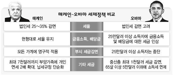 미국 민주당 버락 오바마와 공화당 존 매케인 두 대선 후보의 이념적 차이가 조세정책에서 갈수록 뚜렷해지고 있다. 오바마는 상류층의 세금을 더 걷어 정부 지출을 확대하겠다는 반면, 매케인은 세금과 정부 지출을 모두 줄이겠다고 밝히고 있다. 오바마는 17일치 <월스트리트저널> 인터뷰에서 “세계화, 기술발전, 자동화가 노동자의 지위를 약화시키고 있다”며 부가 보다 공평하게 분배될 수 있도록 정부의 강력한 개입이 필요하다고 강조했다. 그는 미국이 점점 더 “승자독식” 경제로 바뀌면서 경제성장의 열매가 부유층에게 주로 돌아가고 있다며, 세제 개편으로 빈부격차를 줄이겠다는 뜻을 분명히했다. 이런 오바마의 정책기조는 세부 조세정책에서 잘 드러난다. 오바마는 연간 25만달러(약 2억6천만원) 이상 소득자에 대해서는 금융소득 및 주식·보험 배당금에 대한 세금을 인상하겠다고 밝혔다. 매케인이 현형대로 세율을 유지하겠다는 것과 큰 차이다. 조지 부시 대통령이 도입한 일시적 소득세 감면도 오바마는 25만달러 이상 소득자는 중단하자는 반면, 매케인은 영구적으로 적용하자고 밝히고 있다. 오바마의 조세정책을 적용하면, 중산층은 세후 소득이 약 2.4% 늘어나는 반면, 연소득 280만달러 이상 고소득자는 세후 소득이 11.5% 줄어난다. 법인세도 매케인은 25~30% 감면하는 등 친기업적 기조인 반면, 오바마는 감면을 고려할 수 있다는 수준으로 훨씬 유보적이다. 고전적인 ‘작은 정부’론과 ‘큰 정부’론이 정면 충돌하는 양상이다. 오바마는 더 걷은 세금으로 대체 에너지 개발 등 산업기반에 정부의 재정 지출을 확대하고 경기를 부양하는 큰 정부론을 내세우고 있다. 오바마는 기업의 세금 부담을 줄여 성장을 촉진시키겠다는 매케인의 정책에 대해 “경제 성장과 생산성을 실제로 끌어올린다는 증거를 보지 못했다”며 문제가 있는 정책이라고 비판했다. 반면, 최대한 정부 지출을 줄이는 작은 정부를 내세운 매케인 캠프는 오바마를 겨냥해 “시장에 대한 신뢰가 부족한 고전적인 산업정책을 갖고 있다”며 정부를 재정 적자에 빠뜨릴 것이라고 비판했다.김순배 기자marcos@hani.co.kr