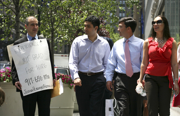 퇴출 금융인 조슈아 퍼스키(왼쪽)가 ‘매사추세츠공대(MIT)를 졸업한 유경험자를 고용하세요’라는 문구를 몸에 걸고 뉴욕 맨해튼 금융가인 월스트리트에서 자신을 홍보하고 있다. 20여년 간 투자은행 등에서 컨설턴트로 일한 퍼스키는 “6달 전 실직한 뒤 이메일과 인맥을 통한 구직활동에서 한계를 느꼈다”며 아내와 다섯 자녀를 먹여 살리기 위해 거리로 나왔다고 말했다.