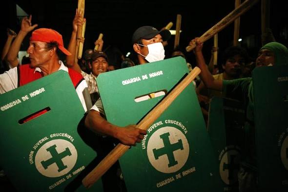 볼리비아의 산타크루스 주정부 청사 밖에서 11일 방패와 몽둥이로 무장한 반정부 시위대 수백명이 자치권 확대 등을 요구하며 시위를 벌이고 있다. 산타크루스/AP 연합