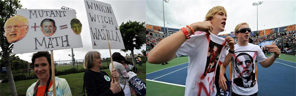 장외 비난전 / 치열 세라 페일린 미국 공화당 부통령 후보가 4일 유세를 벌인 캘리포니아주 카슨에서 양당 지지자들의 비난전이 벌어졌다. 버락 오바마 민주당 대선후보 지지자들은 페일린을 ‘딕 체니 부통령과 조지 부시 대통령이 합쳐친 돌연변이’, ‘알래스카주 와실라의 윙크하는 마녀’라고 비난하는 손 팻말을 들고 있다.(왼쪽) 존 매케인 공화당 대선후보 지지자들은 오바마 후보의 사진 위에 X표가 쳐진 티셔츠를 입고 페일린 후보가 도착하기를 기다리고 있다. 카슨/AFP 연합