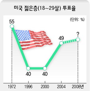 이번주 갤럽이 <유에스에이투데이> <엠티브이>와 공동조사한 여론조사에서는, 30살 이하 유권자의 61%가 오바마를 지지한다고 답변했다. 매케인은 절반에 가까운 32%에 그쳐, 어느 연령층보다도 큰 격차를 보였다. 젊은이들이 가장 나이 많은 대통령 후보인 매케인보다 상대적으로 젊은 오바마에게 끌려서이기도 하지만, 무엇보다 첫 흑인 대통령에 대해 개방적인 사고를 가지고 있기 때문이라고 <로이터>는 분석했다.