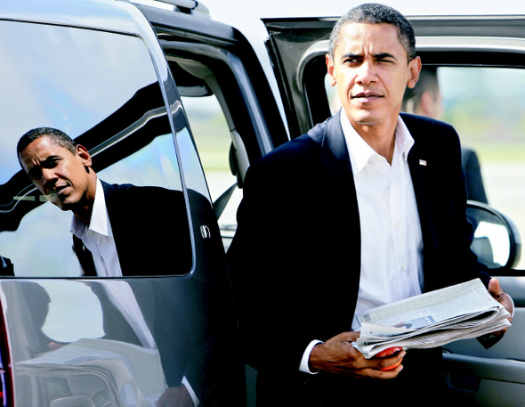 버락 오바마 미국 민주당 대선후보가 8일 인디애나주 인디애나폴리스의 공항에 도착해 차에서 내리고 있다. 인디애나폴리스/AP 연합