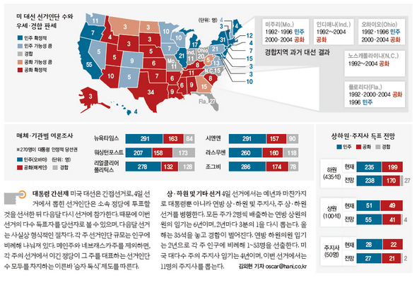 ■ 오바마, 선거인단 확보에서 우위 오바마의 우위는 선거인단 확보에서 확연히 드러난다. 미국 대선은 전체 선거인단 538명 가운데 270명을 확보하면 당선이 확정된다. 오바마는 2004년 존 케리 민주당 후보가 승리해 선거인단 254명을 확보했던 모든 주에서 확실한 우세이다. 더 나아가 아이오와(7), 뉴멕시코(5), 콜로라도(9), 네바다(5)에서 우위를 점한다. 이들 주에서만 모두 이겨도 280명을 확보해 당선이 확실하다.