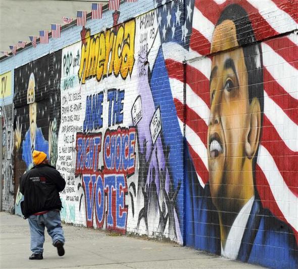 미국 뉴욕 맨해튼 로어이스트사이드 거리에서 3일 한 남자가 버락 오바마 민주당 대선후보(왼쪽)와 존 매케인 미국 공화당 대선후보(오른쪽)가 그려진 담벼락 옆을 걸어가고 있다. 맨해튼/AP 연합