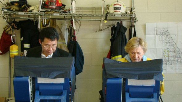 미국 대선일인 4일(현지 시간) 오전 시카고시 교외의 소도시인 노스필드의 소방서에 마련된 투표소에서 투표기를 이용해 한표를 행사하고 있는 시카고 한인회장 정종하씨. (시카고=연합뉴스)