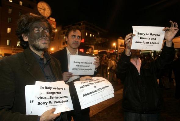 얼굴을 갈색으로 칠한 남성 등 이탈리아인들이 7일 실비오 베를루스코니 이탈리아 총리의 ‘망언’을 규탄하는 시위를 벌이고 있다. 이들이 들고 있는 “오바마 대통령과 미국인들에게 미안해요” “대통령 미안해요. 이탈리아엔 베를루스코니라는 위험한 바이러스가 있어요” 등의 구호는 베를루스코니 총리가 기자회견에서 오바마를 가리켜 “젊고, 잘 생기고, 심지어 선탠까지 했다”고 한 ‘인종주의적’ 발언을 비난하는 내용이다. 로마/AP 연합