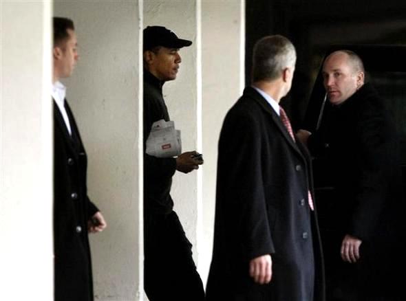 버락 오바마 미국 대통령 당선자(왼쪽 두번째)가 9일 시카고의 한 체육관에서 운동을 마친 뒤 비밀수사국 경호원들의 호위를 받으며 나오고 있다. 시카고/AP 연합