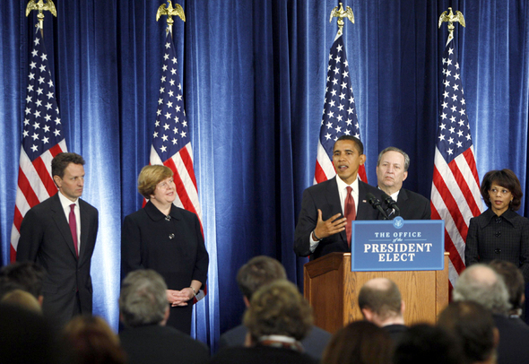 버락 오바마 미대통령당선자이 24일(현지시간) 시카고에서 기자회견을 열어 자신의 경제팀을 전격적으로 발표했다. 티모시 가이스너 재무장관, 크리스티나 로머 경제자문위원회 의장, 버락 오마바 대통령 당선자, 로런스 서머스 국가경제위원장, 멜로디 반즈 백악관 국내정책위원회 위원장. (왼쪽부터) . 취임 2달을 앞두고 있는 오바마 당선자는 22일 2001년까지 일자리 250만개 창출 등을 내용으로 하는 ‘그린 뉴딜‘ 구상을 발표한데 이어 이날 경제팀을 발표하는 등 발빠른 행보를 보이고 있다. 경제 붕괴가 지속되고 있는 다급한 상황 속에서 시장의 불확실성을 최소화하기 위한 조치로 보인다. 이번에 발표된 오바마 경제팀은 균형예산, 자유무역, 금융규제 철폐 등을 앞세운 이른바 ‘루비 노믹스(Rubinomics)‘에 입각한 정책을 펼칠 것으로 보여진다. 시카고/AP 연합뉴스
