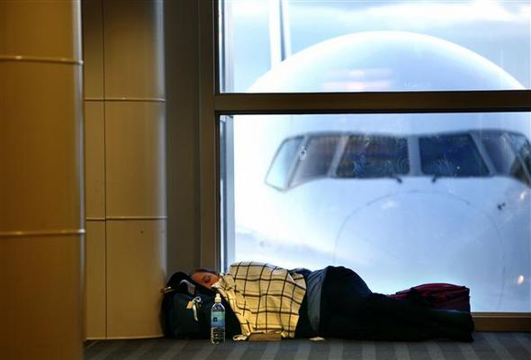 미국 워싱턴주 시택국제공항에서 한 예약 승객이 비행기 운항이 재개되기를 기다리며 공항 바닥에서 잠을 청하고 있다. 이날 미국에선 전날 폭설로 많은 항공편이 결항했다. 시택/AP 연합