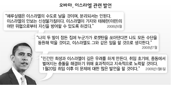 버락 오바마 미국 대통령 당선자가 6일 이스라엘의 가자 침공에 대한 오랜 침묵을 깼다. 오바마 당선자는 “민간인 희생과 이스라엘이 깊은 우려를 하게 만든다”고 밝혔다. 이스라엘의 가자침공 11일만이다. 그는 이날 “취임 초기에, 중동에서 벌어지는 충돌을 해결하기 위해 효과적이고 지속적으로 노력할 것”이라며 “1월20일 취임 이후 이번 사태에 대해 많이 발언할 것”이라고 덧붙였다. 그동안 오바마의 침묵은 과거 발언과 맞물려, 이스라엘의 침공에 대한 암묵적 동의라는 비난을 받아왔다. 알카에다 2인자 아이만 알자와히리가 최근 “이번 공격은 오바마가 취임 전 팔레스타인에 보내는 선물이다”고 반어적으로 비난한 게 대표적이다. <워싱턴 포스트>는 오바마의 정책이 “이스라엘과 팔레스타인의 휴전이 영구적이어야 하며, 하마스를 인정해서는 안된다는 역대 정부의 접근과 다르다는 표시는 거의 없다”고 7일 지적했다. 그러나 ‘단순한’ 뭄바이 테러와 달리, 이번 사태의 민감성을 고려하면 ‘오바마의 침묵=친이스라엘’로 단정하기도 어렵다. 조지 부시 대통령처럼 “이스라엘은 스스로 보호하기 위한 결정을 했다”는 식의 발언을 하지 않은 게, 외교정책의 차이로 해석할 수도 있다. 오바마는 대화를 통한 외교를 줄곧 강조했고, 참모들은 취임 100일 안에 이슬람 국가의 수도에서 새로운 중동정책 접근법을 공개할 것이라고 밝혔다. 이번 사태가 가뜩이나 골치아픈 중동정책을 더욱 어렵게 만든 것은 분명하다. <워싱턴포스트>는 7일 이집트, 요르단, 사우디아라비아 등 오바마의 중동정책 파트너가 될 친서방 아랍국가의 영향력이 이번 사태로 쇠퇴한 것을 악재로 지적했다. <뉴스위크>는 오는 6월로 예정된 레바논 총선에서 헤즈볼라가 승리하면 문제는 더 복잡해질 것이라고 분석했다. 두뇌집단에서는 중동정책의 전환, 곧 아랍권과의 협력을 강조하고 있다. 브루킹스연구소는 5일 “아랍 국가들을 적이 아니라 대화 상대로 대우하며 장기적이고 포괄적 접근을 해야한다”고 제안했다. 특히, 이스라엘이 시리아와 평화적 관계를 맺도록 만들어, 헤즈볼라와 하마스를 지원하는 이란의 영향력을 축소하는 전략을 동시에 펴야한다고 강조했다. <포린 어페어스>도 1·2월호에서, 시리아의 중요성을 강조하고 이라크에 집중된 중동정책 방향을 바꿔야 한다고 제안했다. 이 잡지는 “테러리즘, 핵확산, 에너지 안보 등 국제현안에 대처하려면 중동을 관리해야 한다”며, “위기에 빠진 이스라엘-팔레스타인의 2개 국가 공존안을 이어가려면 하마스를 배제한 정책은 실패할 가능성이 크다”고 지적했다.김순배 기자 marcos@hani.co.kr [한겨레 주요기사]