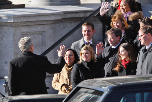 조지 부시 미국 대통령이 14일 워싱턴 백악관 부속 아이젠하워빌딩(딕 체니 부통령의 집무실이 있는 곳)을 나서며 직원들에게 손을 흔들고 있다. 부시 대통령은 이곳에서 직원들과 퇴임 전 마지막 촬영을 했다. 워싱턴/AP 연합