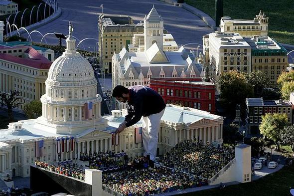 모형 건축가 게리 매킨타이어가 15일 미국 캘리포니아주 칼즈배드에 있는 레고랜드에서 20일로 예정된 버락 오바마 대통령 취임식을 축하하며 레고로 취임식 장면을 만들고 있다. 칼즈배드/AP 연합