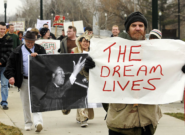 마틴 루터 킹 목사의 기념일인 19일(현지시간) 킹목사의 정신을 기리기 위해 나선 미국 아이다호주 보이시 주민들이 “꿈은 살아있습니다”라는 글을 앞세우고 보이시주립대학교에서 출발해 도심으로 행진을 하고 있다. 보이시/AP 연합뉴스