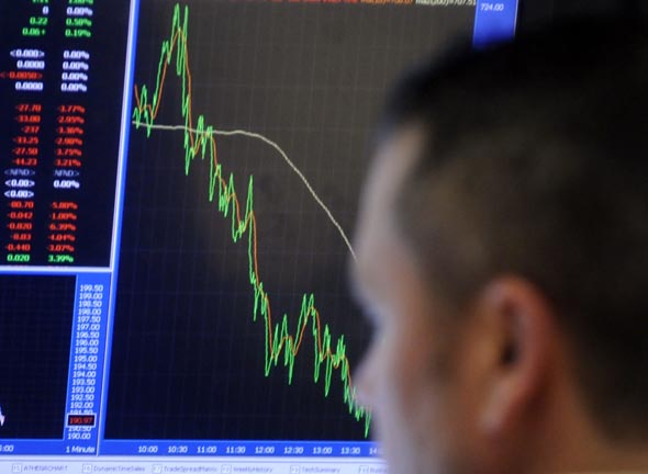 미국 뉴욕증시가 폭락해 1997년 4월 이후 최저수준으로 폭락한 2일(현지시간) 뉴욕증권거래소의 한 주식거래인이 낙담해 고개를 떨구고 있다. 이날 다우지수는 지난 주말에 비해 299.64포인트(4.25%) 떨어진 6,763.29로 장을 마감했다. 뉴욕/AP 연합뉴스