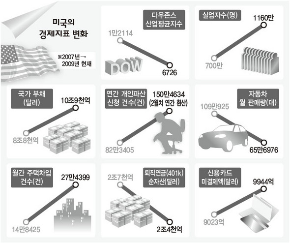2년 전 약 700만건이던 미국 시카고 공공도서관의 도서, 시디(CD), 영화 디브이디(DVD) 대출 건수가 최근 980만건으로 늘었다. 주머니 사정이 팍팍해진 미국인들이 서점 대신 도서관을 찾고 있다. <에이비시>(abc) 방송은 4일 “미국인들이 새로운 경제 현실에 적응하는 많은 방식 중 하나를 보여준다”고 전했다. 방송은 노동부 등 13개 기관을 조사해 2007년 12월 경기후퇴(recession)가 시작된 이후 달라진 미국인들의 경제상을 수치로 보여주고 있다.