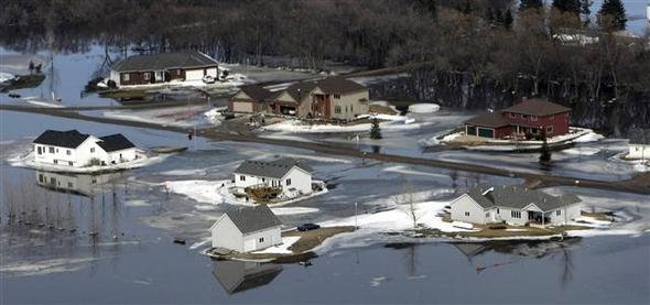 물 위의 집들 미국 노스 다코타주의 파고 마을 남쪽 레드강이 범람해 집들이 물에 잠긴 채 섬처럼 고립돼 있다. 파고/AP 연합