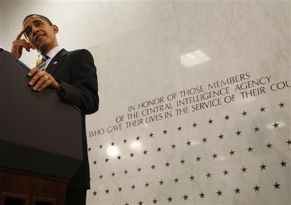 미국 중앙정보국(CIA)의 테러용의자 고문 논란이 확산되는 가운데 20일 버락 오바마 미국 대통령이 취임 뒤 처음으로 버지니아주 랭글리에 있는 중앙정보국 본부를 방문해 직원들에게 연설하고 있다. 뒤쪽에 ‘국가의 임무를 위해 목숨을 바친 중앙정보국 요원들을 기리며’라는 글귀가 보인다. 랭글리/AP연합