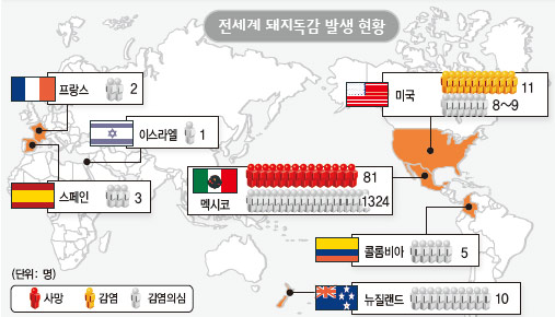 이번 돼지독감의 첫 발생지 멕시코에선 사망자가 81명으로 늘어났고, 미국을 비롯해 뉴질랜드, 프랑스, 이스라엘, 콜롬비아 등에서도 돼지독감 의심 환자가 발견됐다. 각국 보건당국은 멕시코 최근 방문자의 체온을 측정하는 등 비상 방역 시스템을 가동했다.