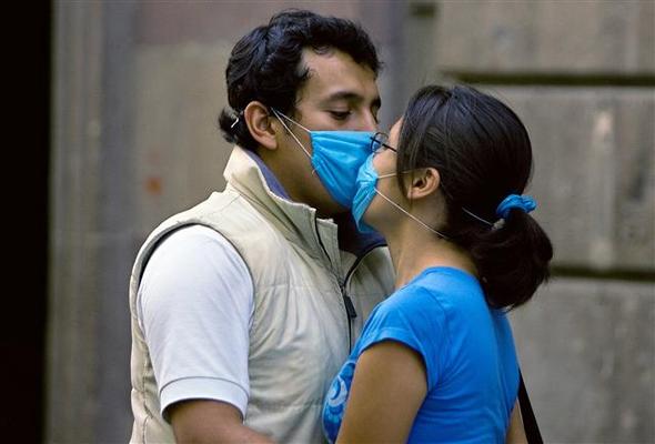 돼지독감으로 인한 사망자가 늘고 있는 멕시코의 수도 멕시코시티 도심 역사지구에서 25일(현지시각) 한 쌍의 연인이 감염을 우려해 수술용 마스크를 쓴 채 입맞춤을 하고 있다. 멕시코시티/AFP 연합