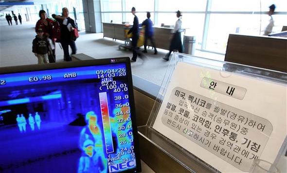 멕시코를 중심으로 돼지독감이 퍼져 수십명의 사망자가 발생한 가운데 26일 방역 당국이 인천국제공항 에서 열감지기로 입국자들의 건강 상태를 살펴보고 있다. 인천공항/연합뉴스