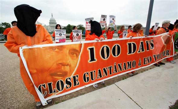 고문에 반대하는 시위대가 30일 미국 워싱턴의 의회 의사당 앞에서 조지 부시 정부 시절 관타나모 미군 기지에서 고문을 받던 테러 용의자의 옷차림을 한 채 시위를 하고 있다. 펼침막에는 ‘(버락 오바마 대통령 취임) 100일, 관타나모 기지를 폐쇄하고 고문을 끝장내라’고 쓰여 있다. 워싱턴/AP 연합