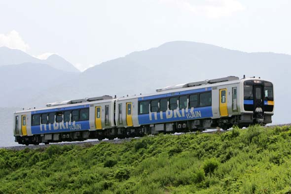 일본 동일본철도가 개발한 세계 최초의 하이브리드 열차 ‘기하 E200’이 27일 북부 사쿠 부근의 오부치자와역에서 시험운행되고 있다. 동일본철도는 이 열차가 디젤엔진과 연료전지를 함께 써 연비를 20%까지 향상시키고, 유해가스 배출은 60% 줄였다고 설명했다. 사쿠/AP 연합