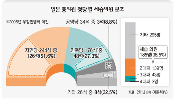 -세습 정치인은 일본에서 어제오늘의 일이 아니다. 최근 들어 그 실태가 국내외에서 조명받는 이유는? = 맞는 말이다. 하토야마 가문처럼 벌써 5대째 정치인을 배출하고 있는 집안도 있다.(그림) 이번에는 아소 다로 1기 내각에 대거 등장한 세습 정치인들이나 고이즈미 준이치로 전 총리 차남의 선거구 승계 등과 맞물렸기 때문이다. 세습정치인은 일본 시민단체들의 단골 낙선운동 소재로 반대 목소리가 높았다. 그러나 일반 국민들의 보편적인 의식으로는 자리잡지 못했다. 이번에도 주목받을 계기가 없었다면 평소처럼 그냥 넘어갔을 것이다. - 일본 정치인들의 세습은 어떻게 이뤄지는가? =3대째 정치인인 고이즈미 전 총리의 집안을 보면 여러가지 경우가 나타난다. 고이즈미의 외할아버지는 체신대신까지 올랐던 마타지로(1865~1951)였다. 아들이 없었던 그는 자기 집에 드나들다 자신의 딸과 야반도주한 한 당직자를 사위로 들여 후계자로 삼았다. 이 당직자는 장인의 후광에 힘입어 32살에 중의원에 진출한다. 그는 성을 고이즈미로 바꿔 가문의 상속자가 됐고 나중에 방위청 장관까지 올랐다. 고이즈미 전 총리의 아버지 준야(1904~69)다. 1969년 준야가 갑자기 사망하면서 영국 런던대학에 유학중이었던 아들 준이치로(전 총리·1942~)가 급히 귀국했다. 준이치로는 그해 선거에 출마했다가 낙선했다. 그 뒤 후쿠다 다케오 전 총리 문하에서 ‘정치 수업’을 받았고, 3년 뒤 선거에서 30살 나이로 당선됐다. 고이즈미 전 총리는 지난달 은퇴를 선언하면서, 미국 유학에서 귀국한 차남 신지로(27)에게 선거구를 물려줄 뜻을 분명히 했다. 선거를 불과 두달도 남겨두지 않은 시점이었다. 선거를 앞두고 갑자기 승계를 발표하는 행태는 흔한 세습방식이다. 치사하다고 할 수도 있지만 경쟁자들에게 시간을 주지 않는 효과를 거둘 수 있다. - 세습 정치인들이 선거에서 강점을 보이는 이유는? =일본 정치에서는 선거승리의 필요 요소로 ‘3반’을 꼽는다. 첫째는 지반(地般), 곧 선거를 치를 수 있는 조직 기반이다. 둘째는 간반(간판·看板)으로, 유권자 및 지지자들에게 호소할 수 있는 지명도를 의미한다. 세번째는 가반(가방)이다. 선거자금을 모으는 통로 등 자금원을 뜻한다. ‘3반’에서 세습 정치인은 비세습 정치인에 비해 월등히 뛰어나다. - 세습정치인을 낳는 지역구와 중앙무대의 특수성은 없는가? =일본의 오랜 중선거구 전통은 한 선거구에서 여러 명을 당선시키기 위해 중앙당 대신 당내 각 파벌이 선거를 개별적으로 준비하는 현실을 낳았다. 때문에 후보의 선거운동은 후원회와 이익단체 등 지역 지지자 단체들이 진행하는 경우가 많다. 당선 뒤에도 지지자 단체들은 공공사업 배당 같은 이권 분배에 관여하는 등 정당 지역사무소 기능을 일부 갖는다. 이런 막강한 조직도 의원이 은퇴하면 해산 위기에 내몰린다. 후원회의 유지와 존속을 위해 후계자를 택해야 하는데, 누구나 동의할 수 있는 부인·자녀가 ‘안전한 선택지’인 셈이다. 결국 의원을 중심으로 하는 ‘이익 공동체’는 세습을 통해 존속·재생산되고 기득권 구조가 유지된다. 90년대 정치개혁으로 소선거구제를 도입해 이른바 ‘돈 적게 드는 선거’로 변화했다고 하지만, 오히려 경쟁이 치열해지면서 기득권에 유리하게 작용하는 현실이다. 중앙 무대에서 세습 정치인들은 ‘거물’이 되기 쉬운 구조다. 30대에 초선의원으로 시작해 4~5선 의원이 되고 40대 후반에 장관직을 맡으면, 자연히 파벌의 지도급 인사가 되고 총리감으로 언급된다. 50대나 돼서야 정계에 첫발을 내딛는 비세습 정치인들과 비교할 수 없다. 예외적으로 지난 2005년 고이즈미 전 총리의 우정민영화 개혁 당시 정치 신인들이 대거 원내에 진출한 적이 있었다. 아주 특수한 경우였다.