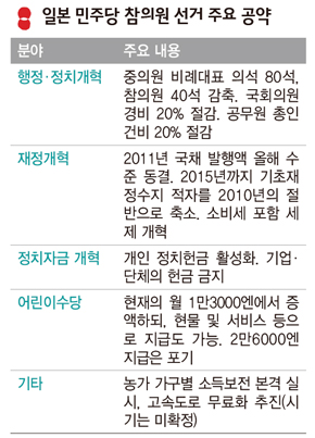 정치개혁과 관련해선 “개인의 정치헌금을 활성화할 수 있게 세제를 개편하는 한편, 기업과 단체의 헌금을 전면 금지한다”는 공약을 계속 추진하기로 했다. 이와 함께 중의원 비례대표 정수를 180석에서 100석으로 80석, 참의원 의석은 242석에서 202석으로 40석 줄이겠다고 밝혔다. 민주당은 이를 통해 의원 총경비를 20% 줄이고, 공무원 인건비도 총경비 기준으로 20% 절감하겠다고 약속했다.