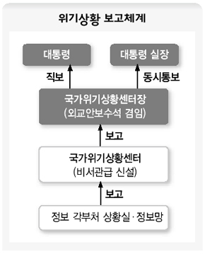 그동안의 보고체계는 ‘위기정보상황팀장 → 대통령실장 → 대통령’이지만, 법적 위상과 책임이 불분명한 임시체제였다. 지난 11일 금강산 사고 때 위기정보상황팀장은 대통령실장과 외교안보수석에게 사건을 보고했으나, 실장과 수석이 그 즉시 대통령에게 보고하지 않았다. 그러나 앞으로는 ‘국가위기상황팀장 → 국가위기상황센터장 → 대통령’의 직보 체제가 대통령훈령을 통해 강제되며, 그만큼 법적 위상과 책임도 명확해진다.