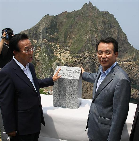 역대 총리 가운데 처음으로 독도를 방문한 한승수 국무총리가 29일 오전 동도 헬기장에 표지석을 설치한뒤 김관용경상북도지사와 이야기 하고 있다. (독도=연합뉴스)