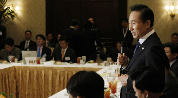 이명박 대통령이 17일 오전(한국시각) 숙소인 워싱턴 윌러드호텔에서 열린 워싱턴 주재 특파원과의 오찬간담회에서 이야기하고 있다.