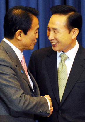 이명박 대통령이 12일 오전 청와대에서 방한 중인 아소 다로 일본 총리와 정상회담을 한 뒤 공동 기자회견에 앞서 악수하고 있다. 청와대사진기자단