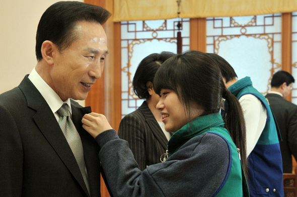 이명박 대통령이 21일 오후 청와대를 방문한 유종하 대한적십자사 총재에게 적십자회비를 전달한 뒤 적십자사 배지를 달고 있다. 연합뉴스