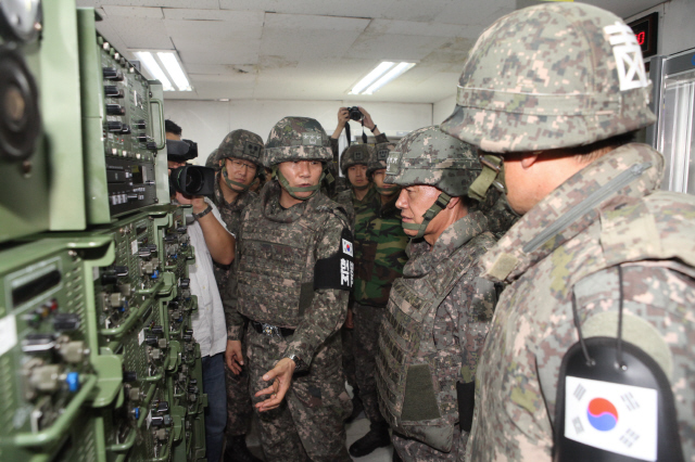 최윤희 합참의장(오른쪽 둘째)이 18일 오후 중동부전선 일반전초(GOP) 부대를 방문해 대북 확성기 방송실을 점검하고 있다. 합동참모본부 제공