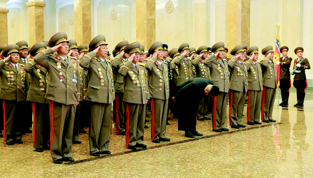 김정은 북한 노동당 제1비서가 15일 김일성 주석의 104회 생일인 태양절(4월15일)을 맞아 인민군 간부들과 금수산태양궁전을 참배하고 있다. 인민군 차수인 김영춘 전 인민무력부장과 현철해 전 인민무력부 제1부부장한테 ‘원수’ 칭호가, 인민군 대장인 리명수 총참모장에게 ‘차수’ 칭호가 수여됐다고 이날 북한 관영 <조선중앙통신>이 전했다. 북한에선 지난해 11월 ‘마지막 인민군 원수’ 리을설 사망 이후 김정은 제1비서를 빼곤 ‘원수’가 한명도 없었다.
