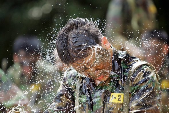 육군 제31사단 신병교육대에서 각개전투 훈련을 마치고 수통의 물을 얼굴에 뿌리며 더위를 식히고 있다. 연합뉴스
