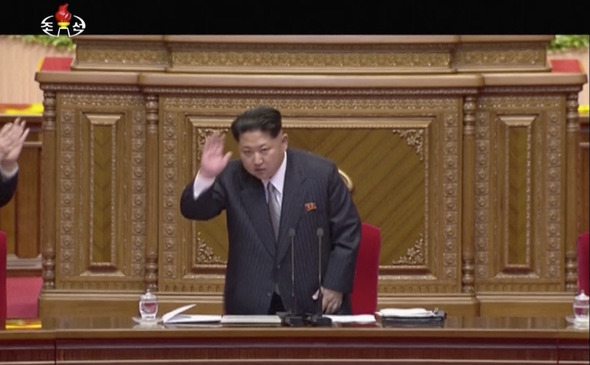 조선중앙TV와 라디오방송인 조선중앙방송 등 북한 언론매체들은 6일 평양 4.25문화회관에서 개막한 조선로동당 제7차대회를 녹화실황중계했다. 사진은 정장차림의 김정은 제1위원장이 당제7차대회에서 개회사를 하고 있는 장면. 조선중앙방송 화면갈무리/ 연합뉴스