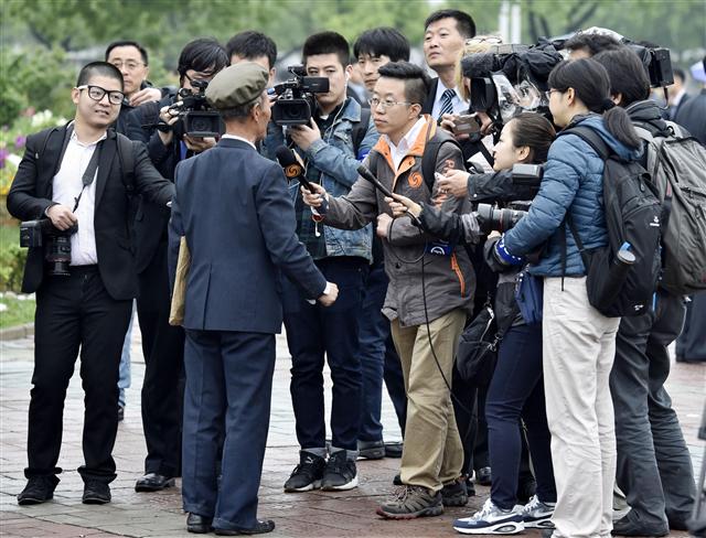 ‘김정은 시대’를 공식화하는 북한 제7차 노동당 대회가 열린 6일, 평양에 온 외신 기자들이 당 관계자를 상대로 질문을 퍼붓고 있다. 이날 전세계에서 120여명의 기자들이 평양으로 몰려왔으나, 북한 당국은 대회장 내부 접근을 불허하고 행사장 근접 촬영도 금지했다. 평양/교도 연합뉴스