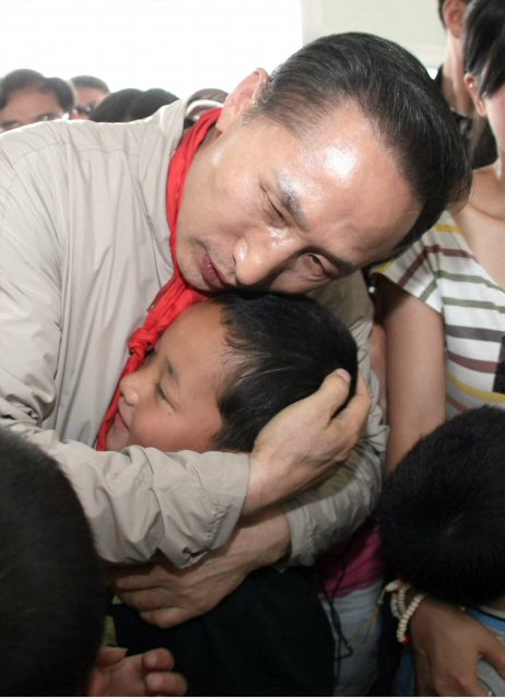 이명박 대통령이 30일 오후 지진 피해를 입은 중국 쓰촨성 두장옌시를 방문, 이재민촌에 있는 임시학교에서 아이들을 안아주고 있다. (청뚜=연합뉴스)